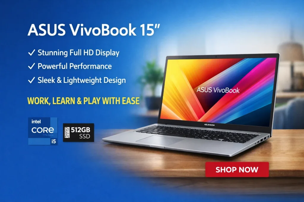 The Asus VivoBook 15 is a popular laptop known for its stylish design, strong everyday performance, and affordable pricing. It is made for people who need a reliable laptop for daily tasks such as studying, office work, online meetings, browsing, and entertainment.